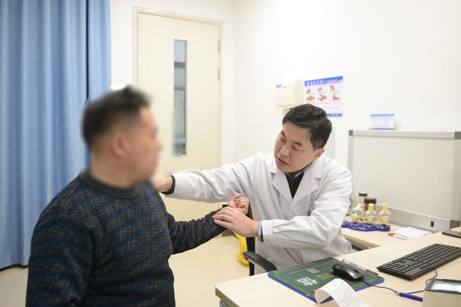 在骨科诊室,耿庆贺主任正在为一位肩周炎患者进行问诊。他耐心地询问患者的病史和症状,并进行了详细的体格检查。